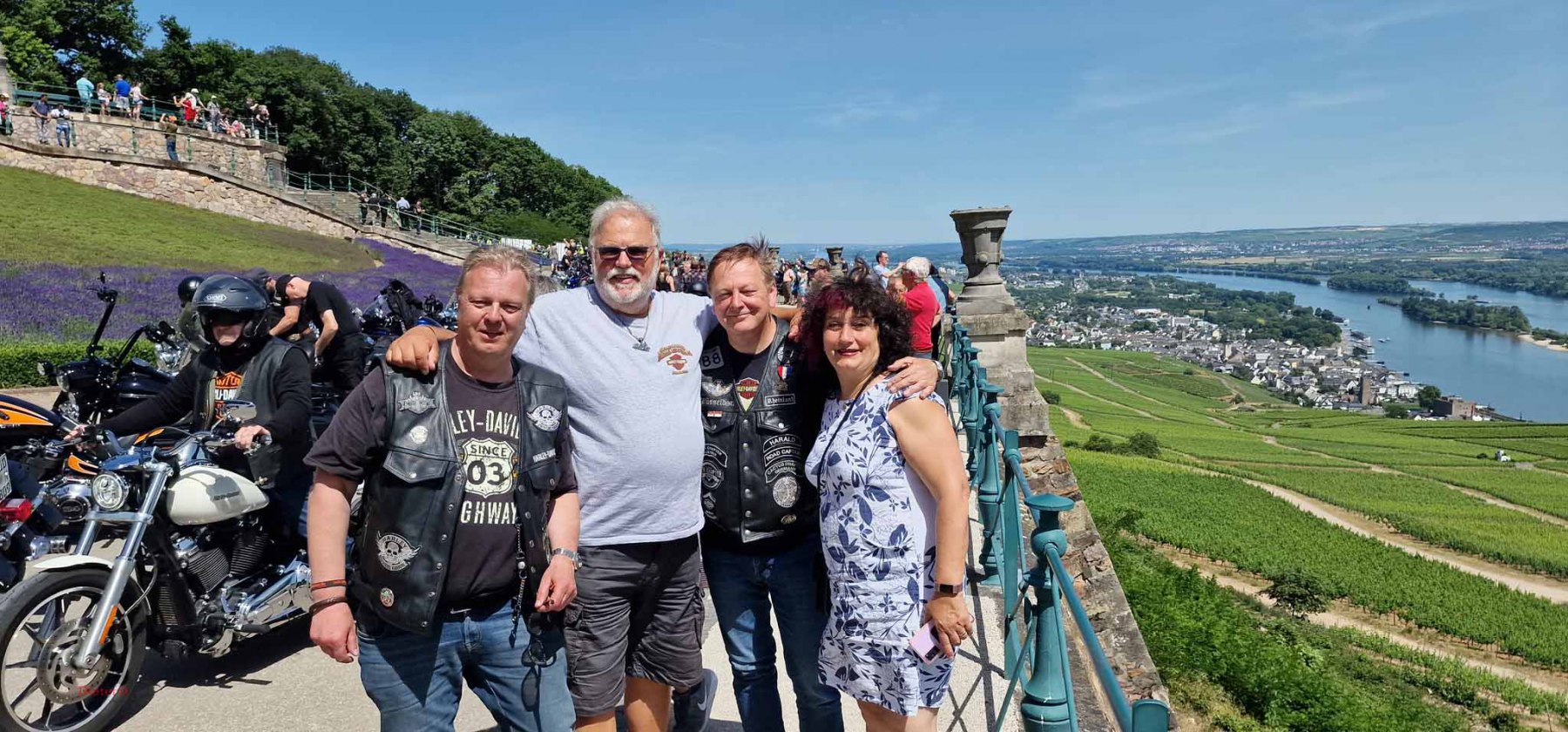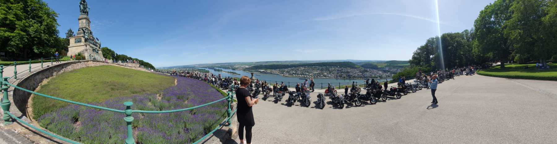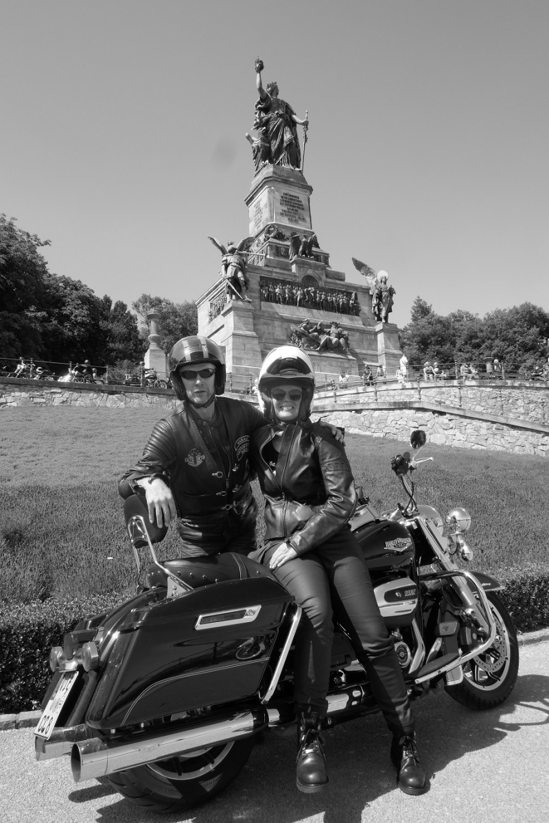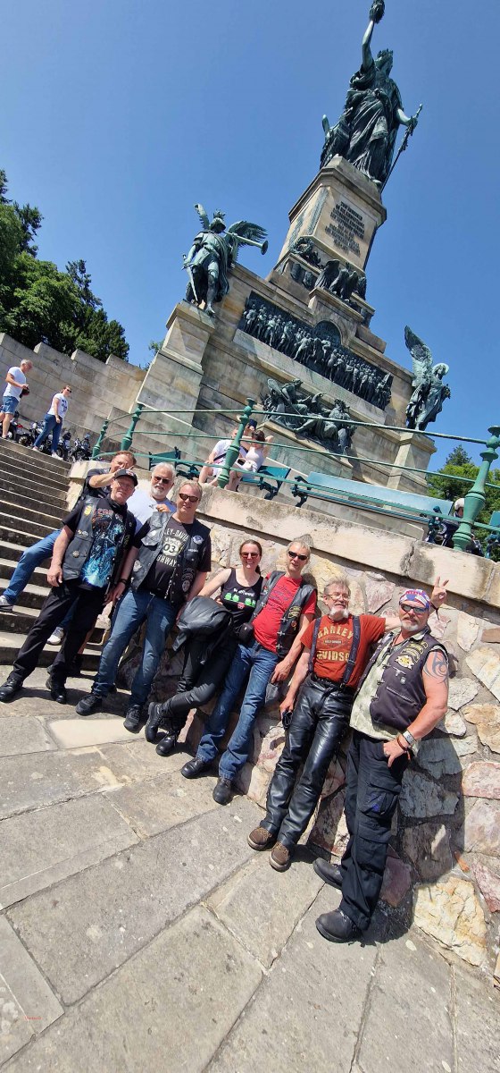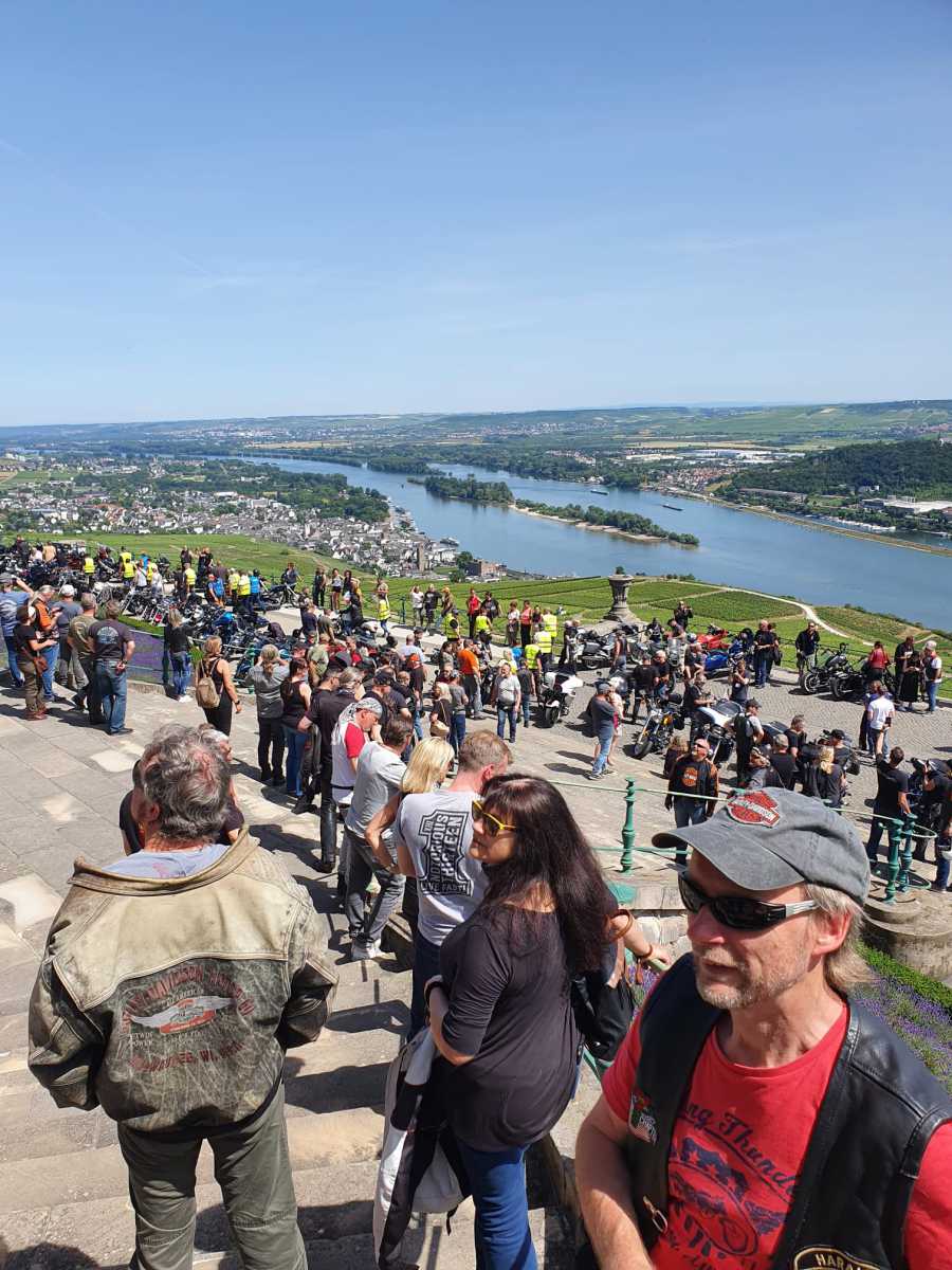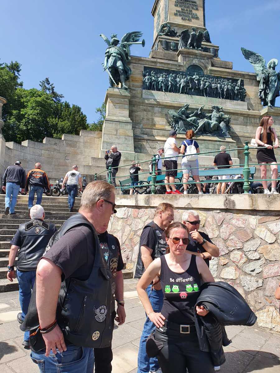 Tag 2:Nach einem gemeinsamen Frühstück unter unseren Bäumen fuhren die Biker zur Aufstellung für eine geführte Rundfahrt. Unser Director Achim verließ uns leider in Richtung Bielefeld. Emel und ich fuhren durch den Rheingau und füllten in einem wunderschönen Weingut die Riesling Vorräte auf. Anschließend ging es zum Niederwalddenkmal. Dieses war auch Endpunkt der geführten Touren und somit kamen wir wieder alle zusammen. Die Organisatoren der MBR hatten eine Sondergenehmigung für die Harley´s und alle durften für ein Fotoshooting direkt vors Denkmal fahren. Eine superschöne Sache mit toller Aussicht. Am Abend gab es eine Pizza in der Pizzeria am Campingplatz und dann wieder die Tour übers Festival.