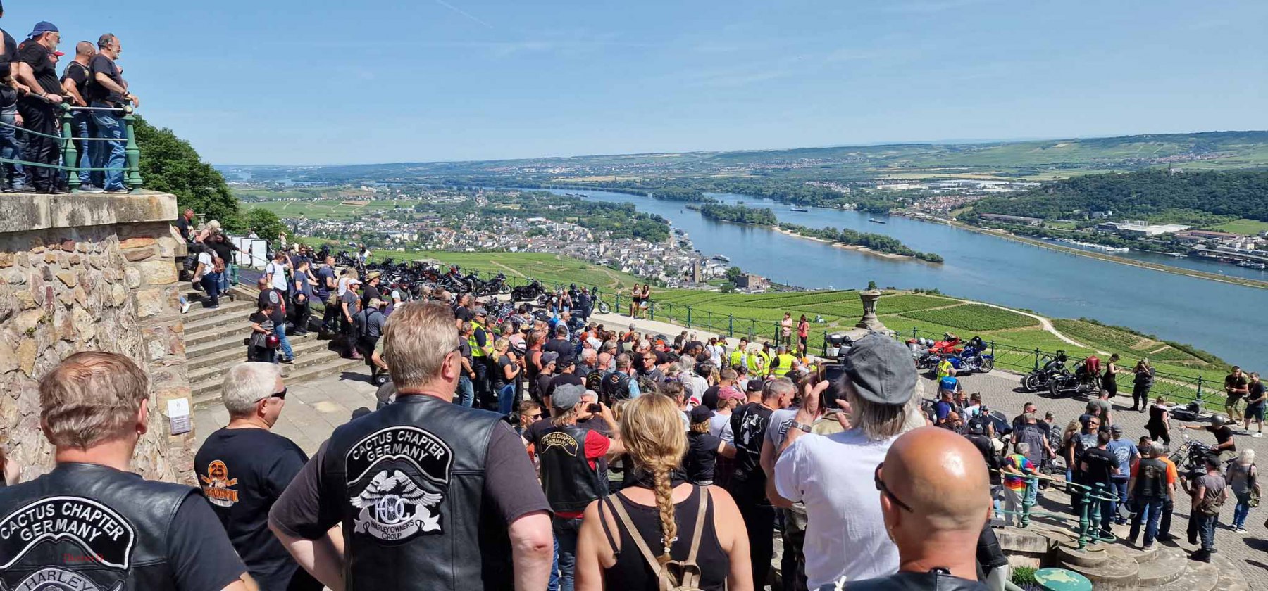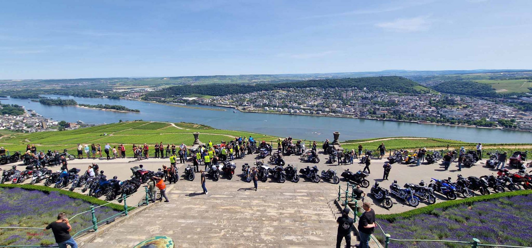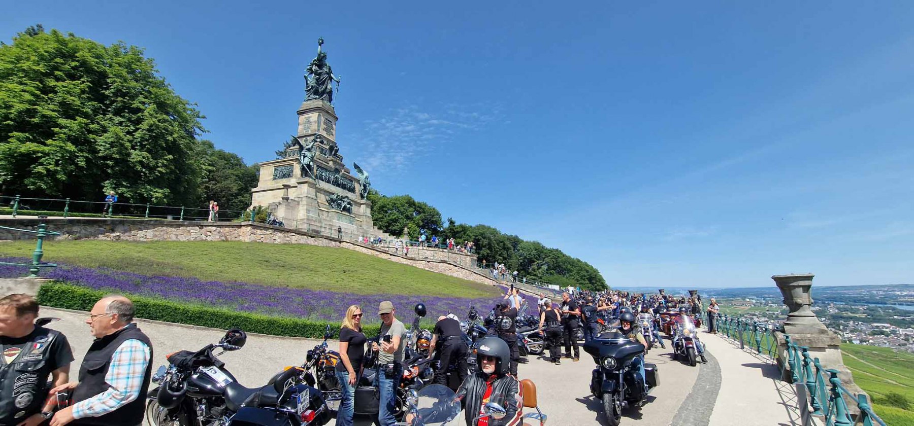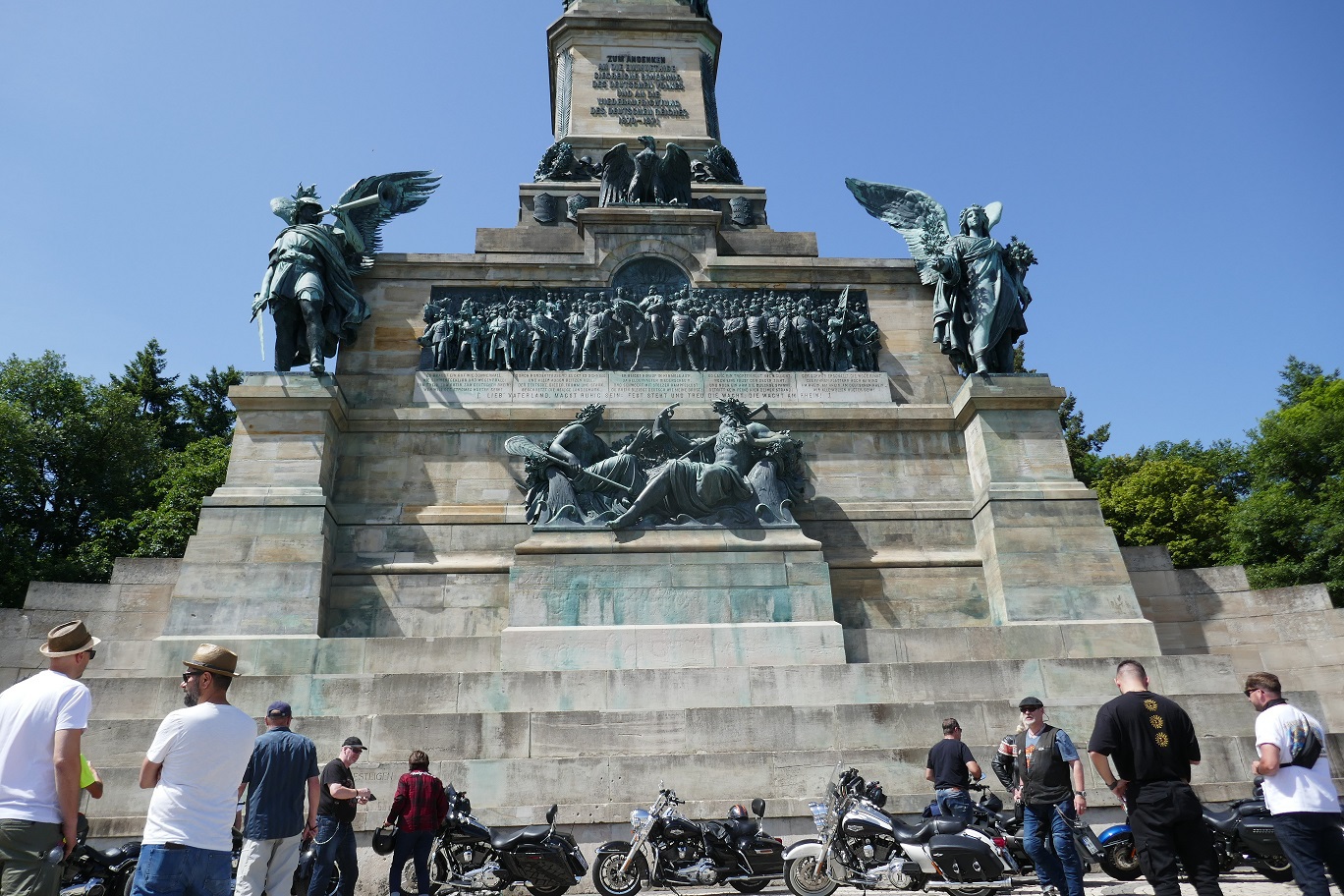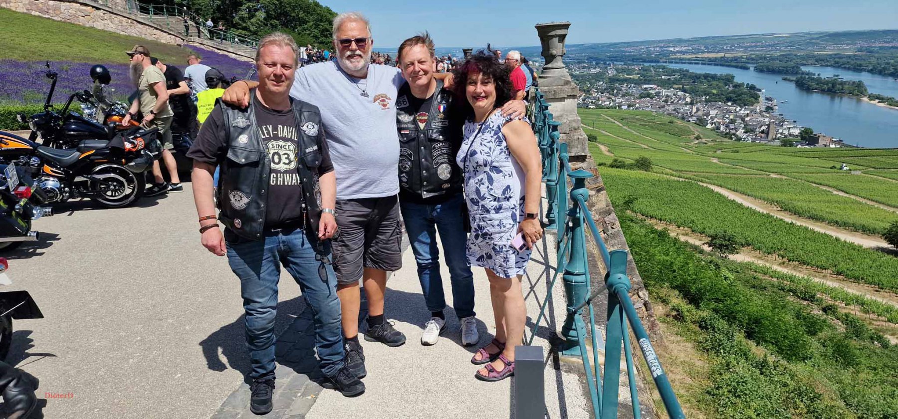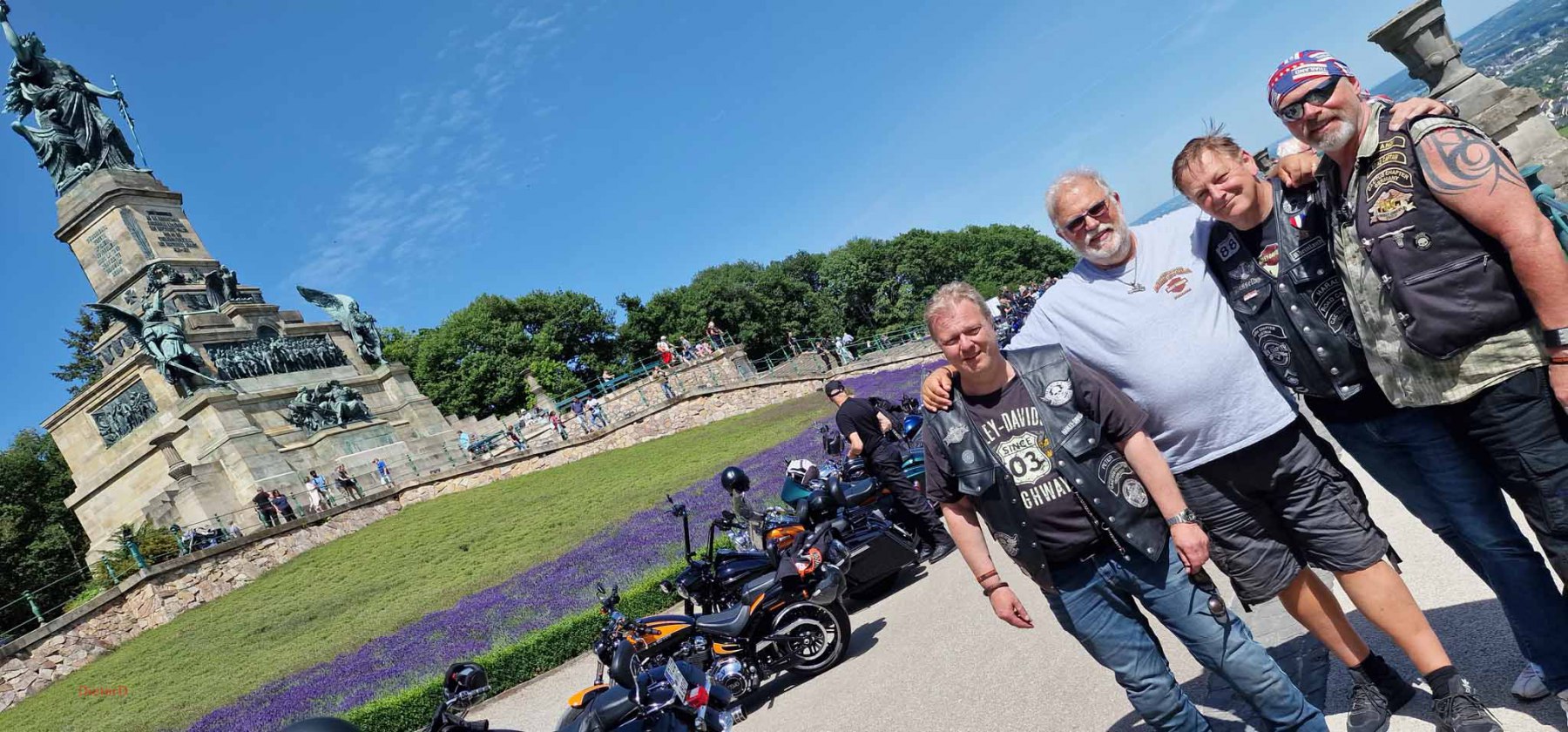Tag 2:Nach einem gemeinsamen Frühstück unter unseren Bäumen fuhren die Biker zur Aufstellung für eine geführte Rundfahrt. Unser Director Achim verließ uns leider in Richtung Bielefeld. Emel und ich fuhren durch den Rheingau und füllten in einem wunderschönen Weingut die Riesling Vorräte auf. Anschließend ging es zum Niederwalddenkmal. Dieses war auch Endpunkt der geführten Touren und somit kamen wir wieder alle zusammen. Die Organisatoren der MBR hatten eine Sondergenehmigung für die Harley´s und alle durften für ein Fotoshooting direkt vors Denkmal fahren. Eine superschöne Sache mit toller Aussicht. Am Abend gab es eine Pizza in der Pizzeria am Campingplatz und dann wieder die Tour übers Festival.