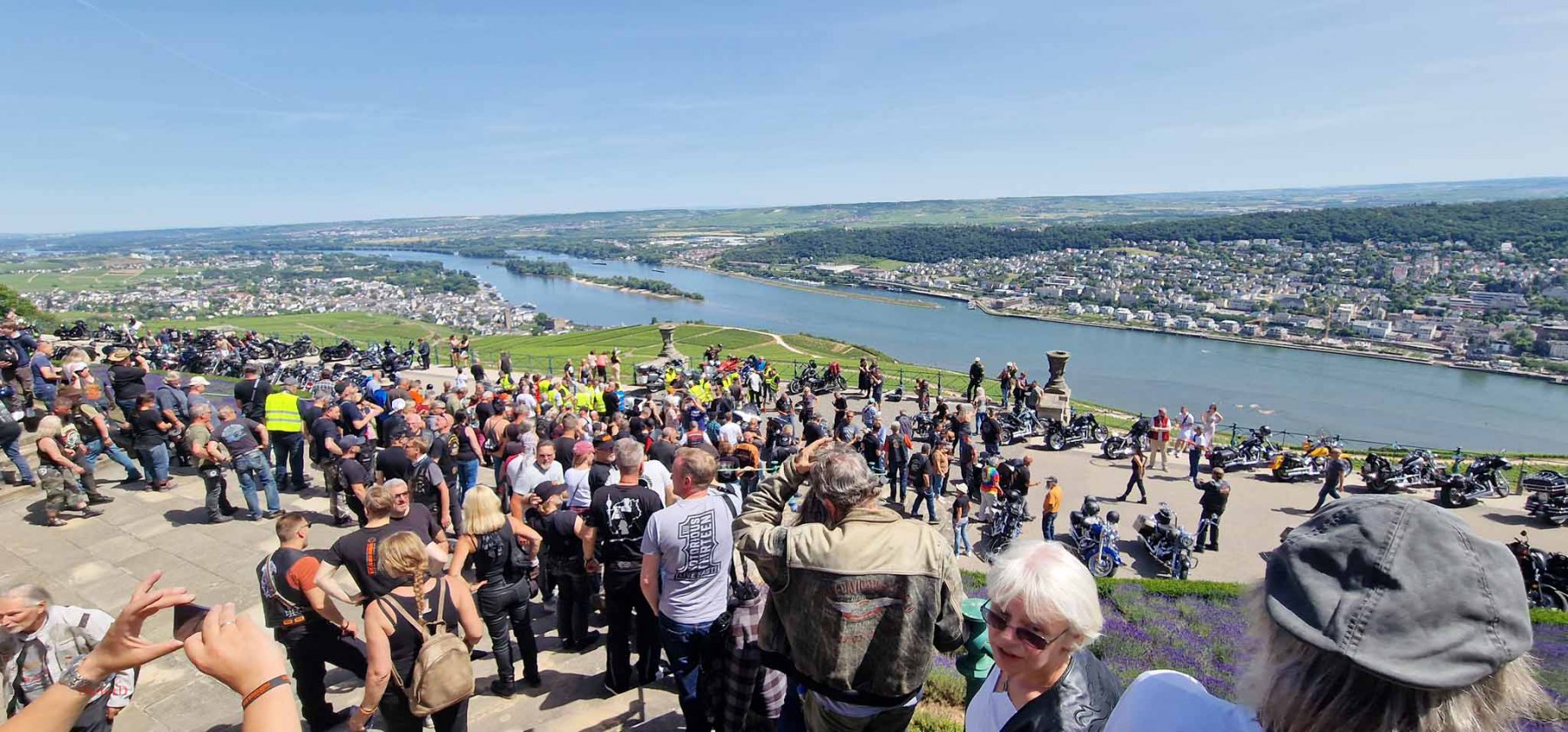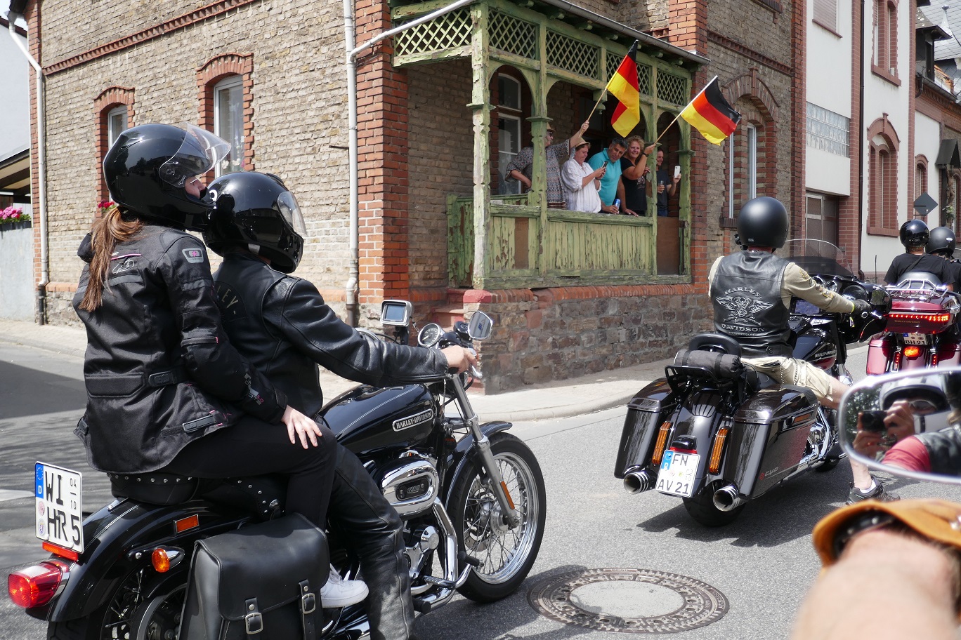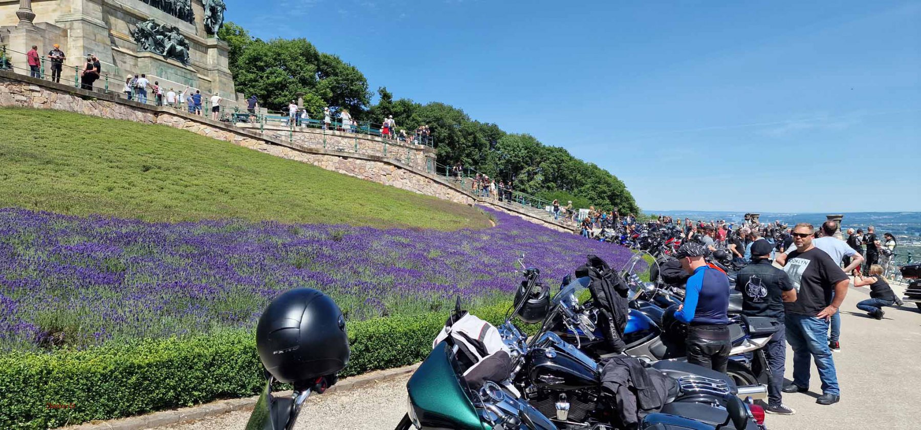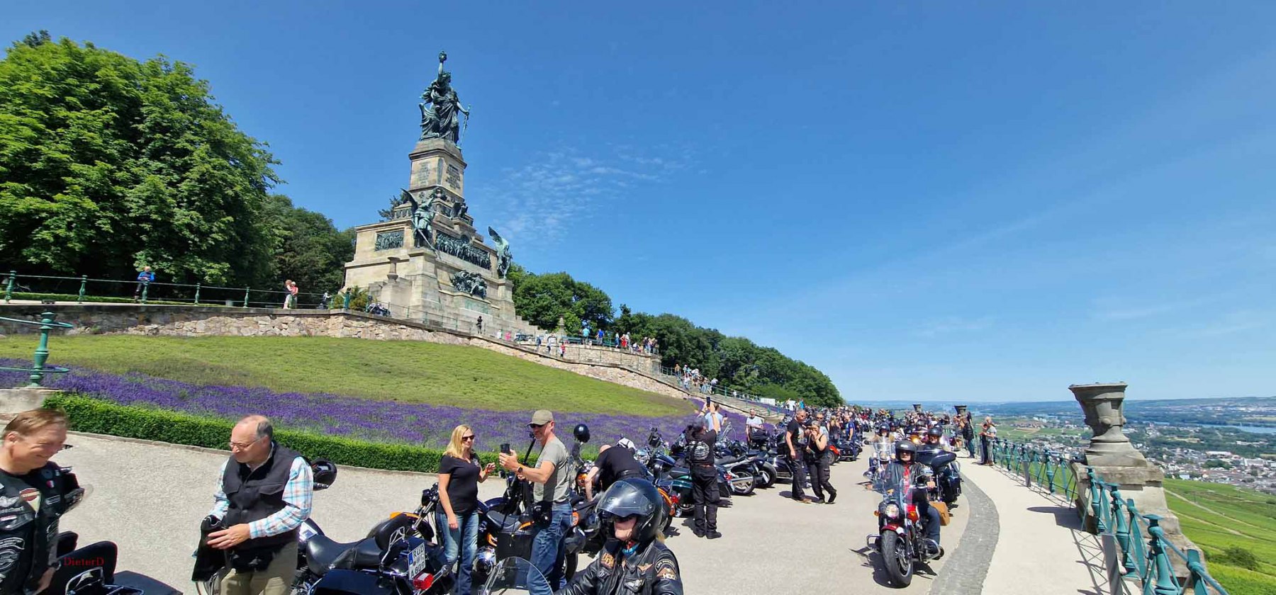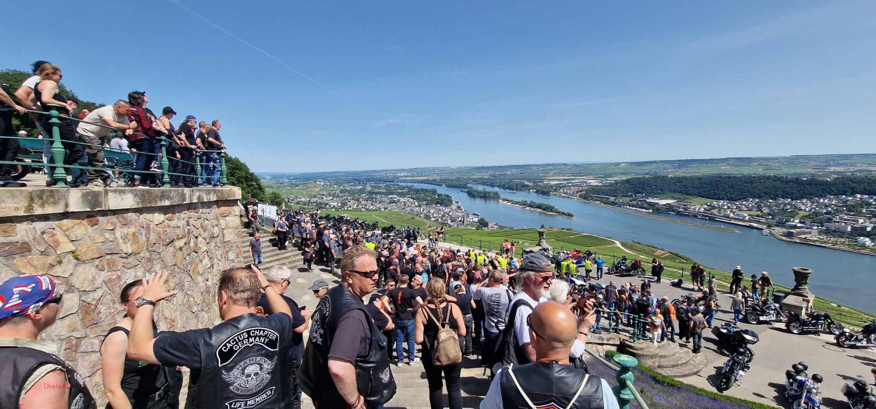 Tag 2:Nach einem gemeinsamen Frühstück unter unseren Bäumen fuhren die Biker zur Aufstellung für eine geführte Rundfahrt. Unser Director Achim verließ uns leider in Richtung Bielefeld. Emel und ich fuhren durch den Rheingau und füllten in einem wunderschönen Weingut die Riesling Vorräte auf. Anschließend ging es zum Niederwalddenkmal. Dieses war auch Endpunkt der geführten Touren und somit kamen wir wieder alle zusammen. Die Organisatoren der MBR hatten eine Sondergenehmigung für die Harley´s und alle durften für ein Fotoshooting direkt vors Denkmal fahren. Eine superschöne Sache mit toller Aussicht. Am Abend gab es eine Pizza in der Pizzeria am Campingplatz und dann wieder die Tour übers Festival.