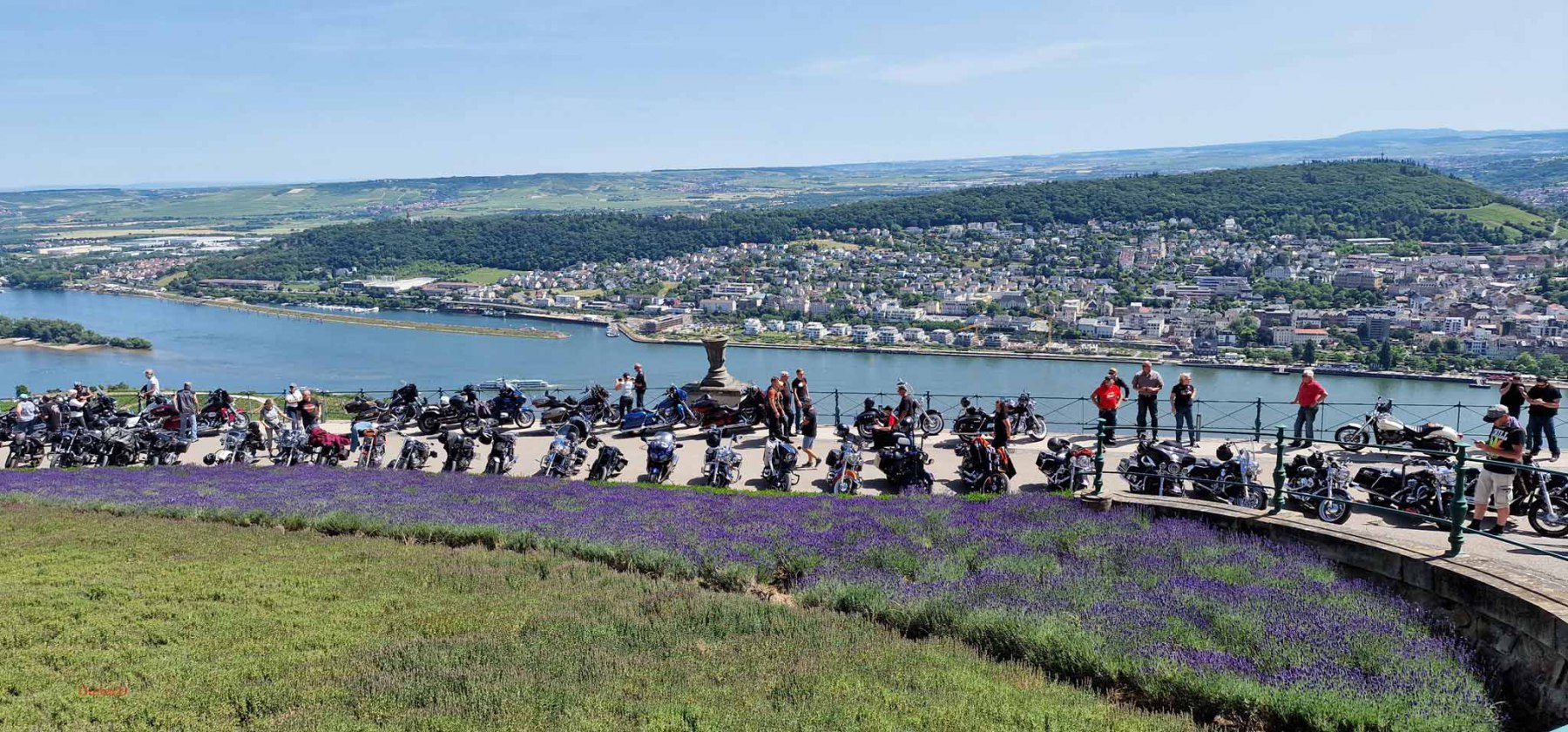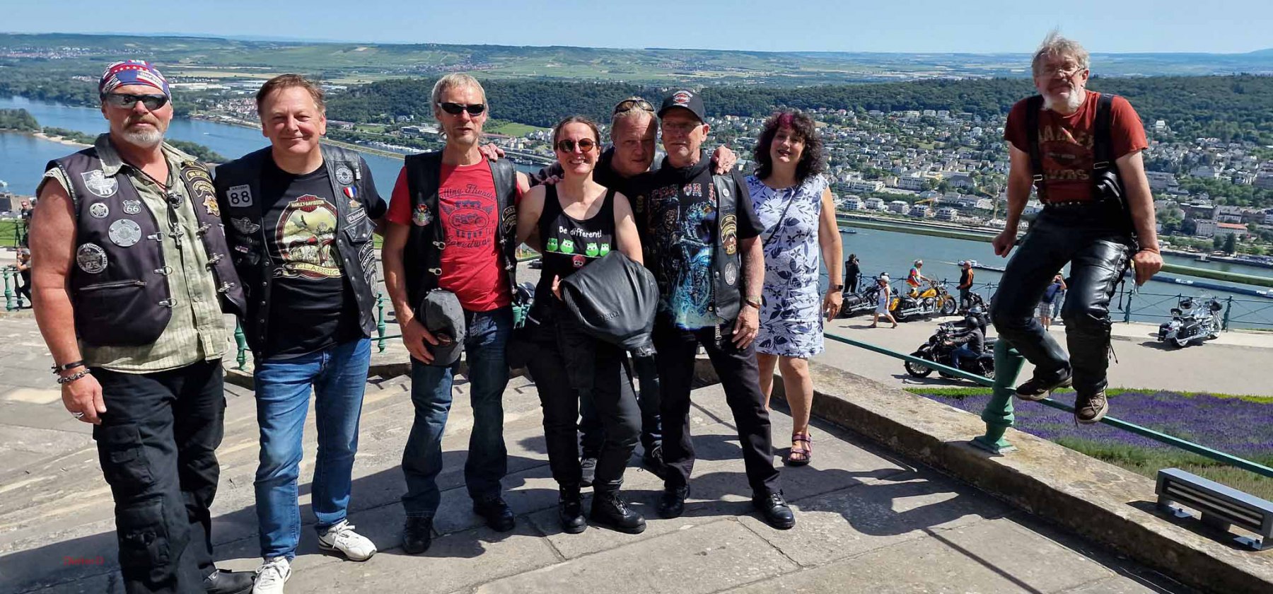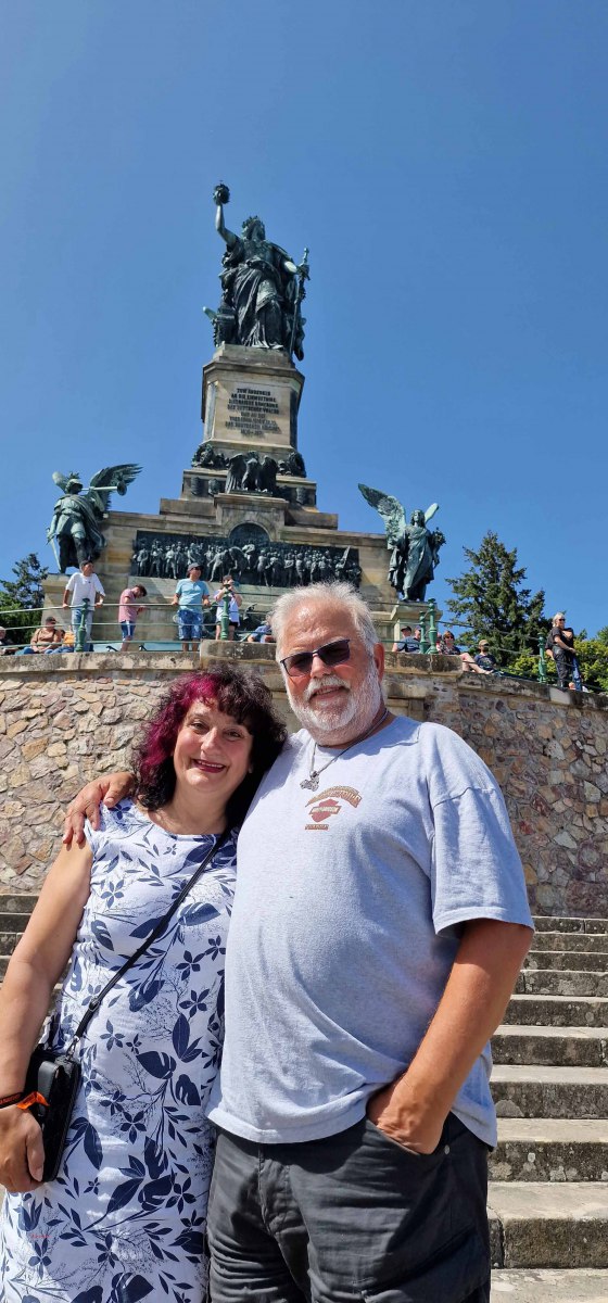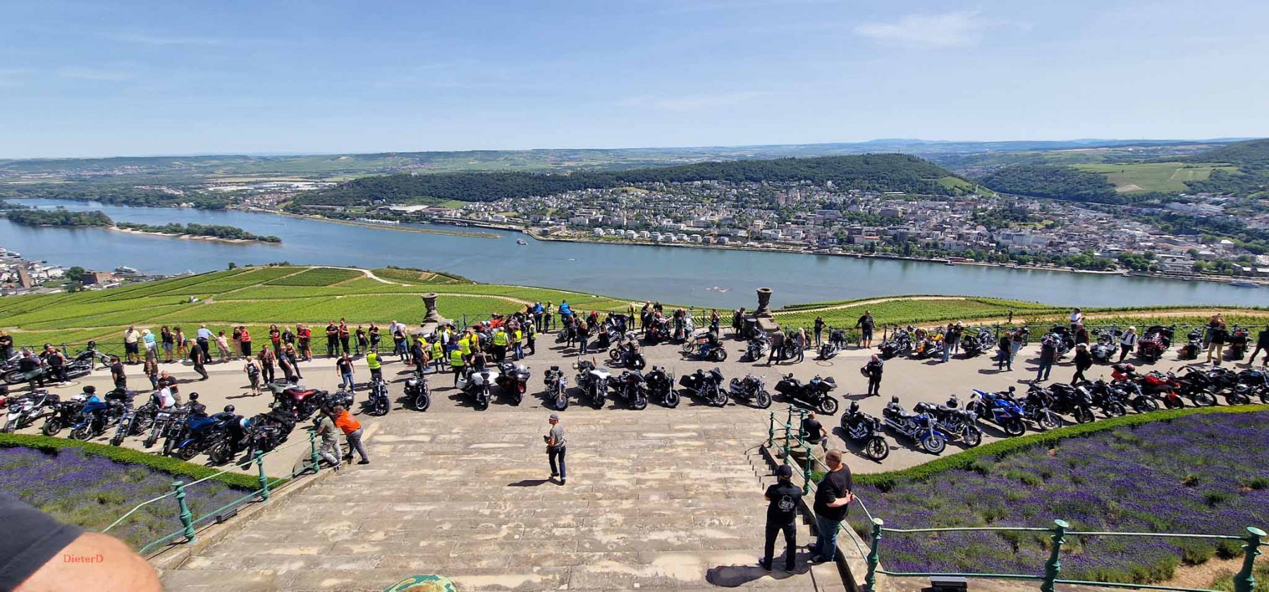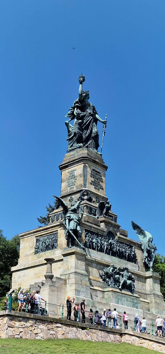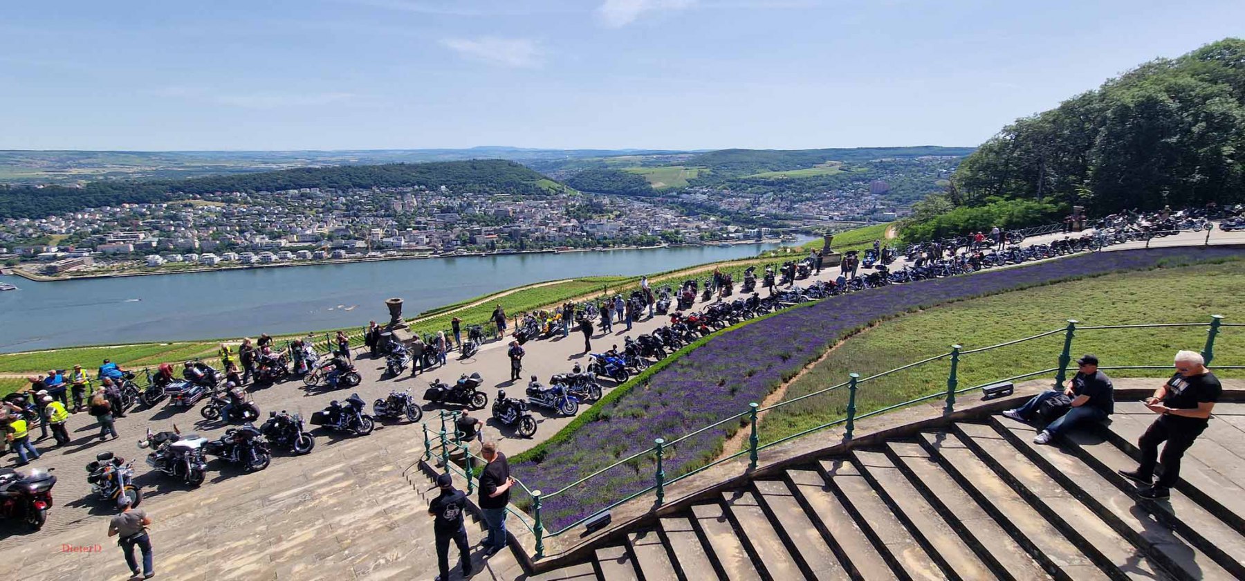 Tag 2:Nach einem gemeinsamen Frühstück unter unseren Bäumen fuhren die Biker zur Aufstellung für eine geführte Rundfahrt. Unser Director Achim verließ uns leider in Richtung Bielefeld. Emel und ich fuhren durch den Rheingau und füllten in einem wunderschönen Weingut die Riesling Vorräte auf. Anschließend ging es zum Niederwalddenkmal. Dieses war auch Endpunkt der geführten Touren und somit kamen wir wieder alle zusammen. Die Organisatoren der MBR hatten eine Sondergenehmigung für die Harley´s und alle durften für ein Fotoshooting direkt vors Denkmal fahren. Eine superschöne Sache mit toller Aussicht. Am Abend gab es eine Pizza in der Pizzeria am Campingplatz und dann wieder die Tour übers Festival.
