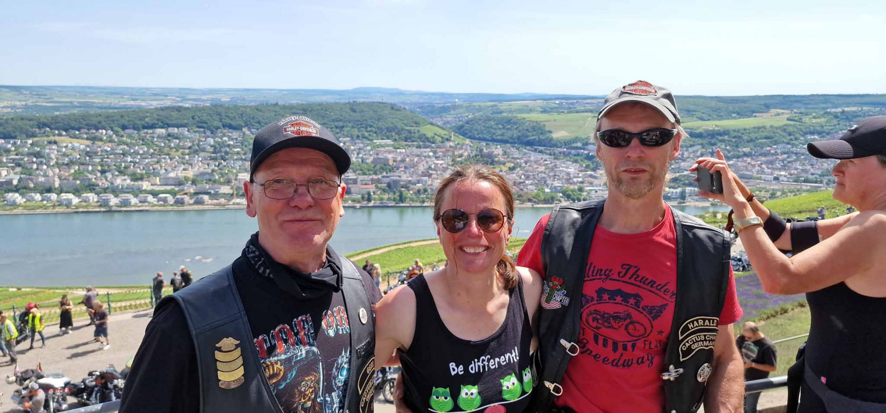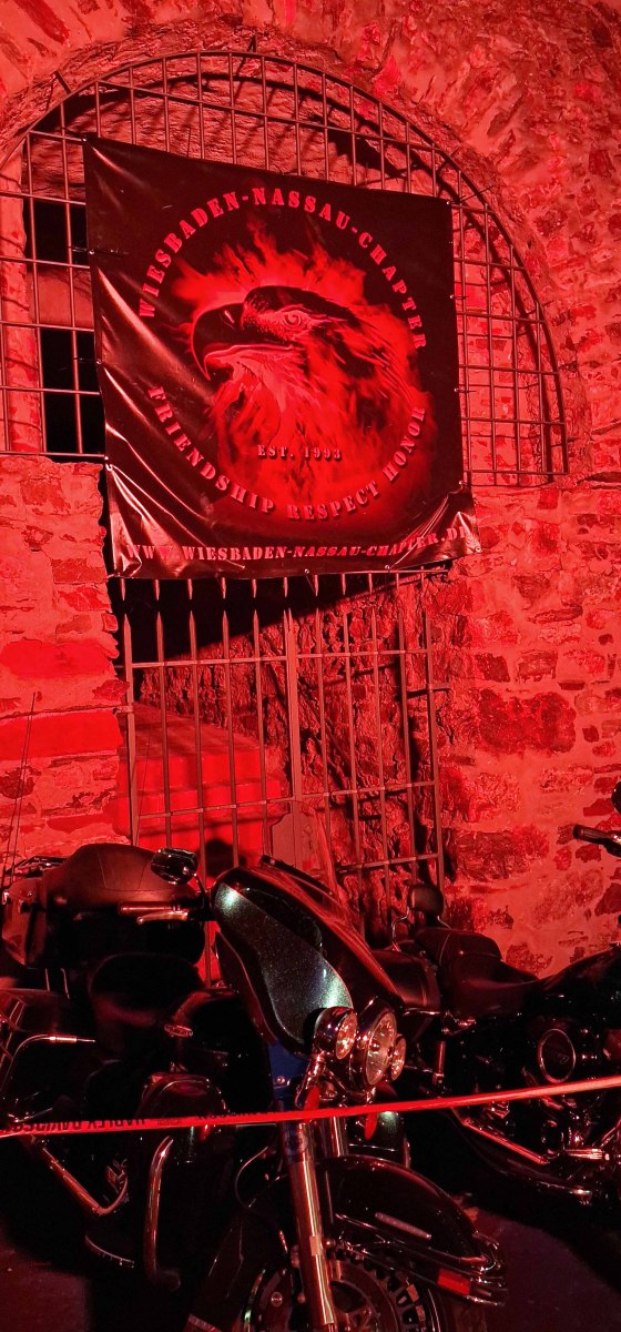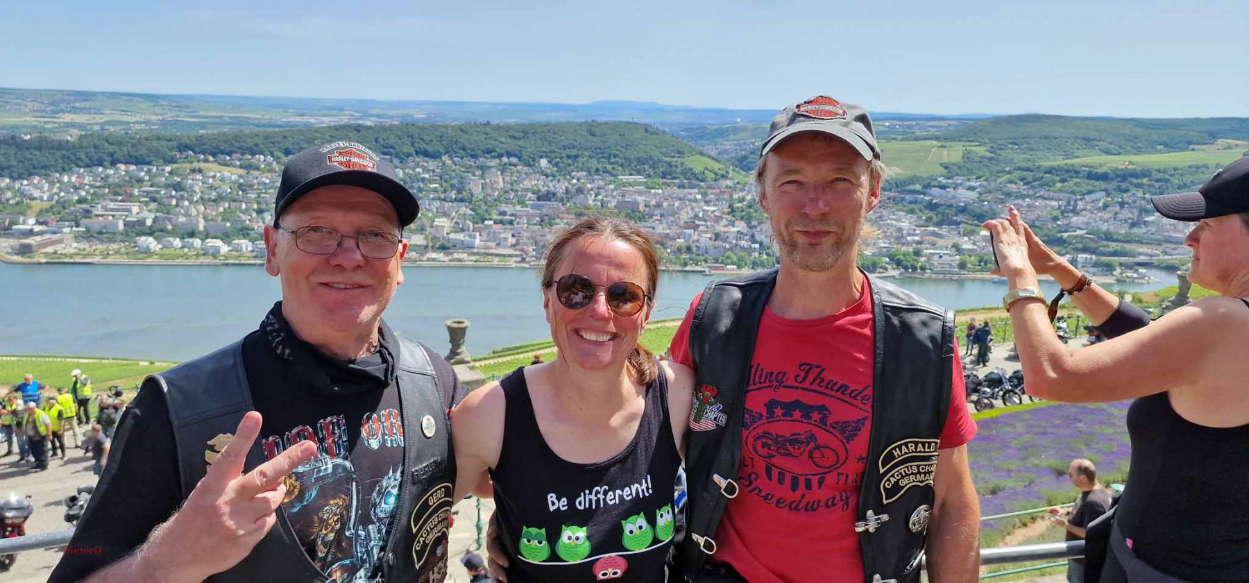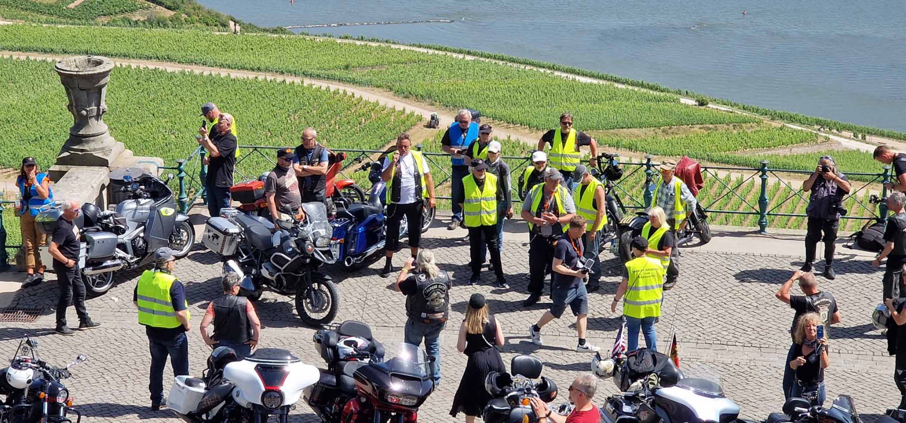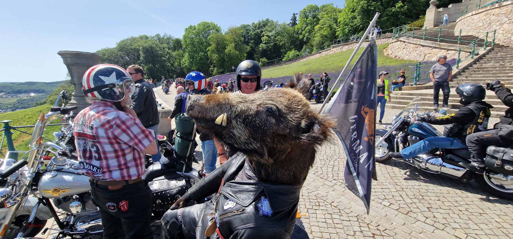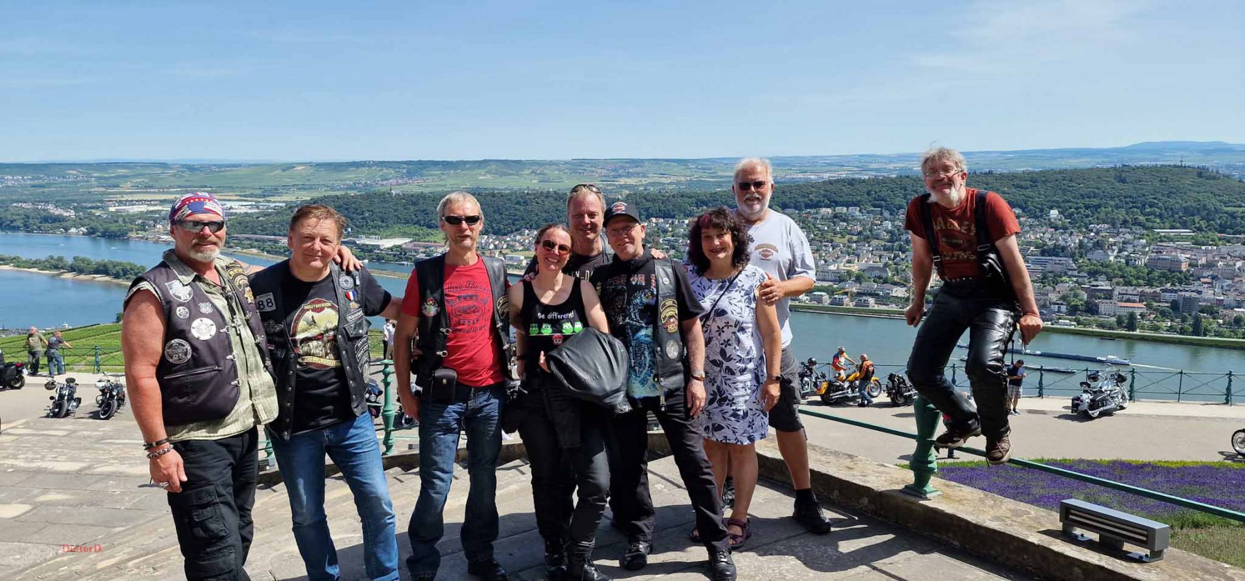 Tag 2:Nach einem gemeinsamen Frühstück unter unseren Bäumen fuhren die Biker zur Aufstellung für eine geführte Rundfahrt. Unser Director Achim verließ uns leider in Richtung Bielefeld. Emel und ich fuhren durch den Rheingau und füllten in einem wunderschönen Weingut die Riesling Vorräte auf. Anschließend ging es zum Niederwalddenkmal. Dieses war auch Endpunkt der geführten Touren und somit kamen wir wieder alle zusammen. Die Organisatoren der MBR hatten eine Sondergenehmigung für die Harley´s und alle durften für ein Fotoshooting direkt vors Denkmal fahren. Eine superschöne Sache mit toller Aussicht. Am Abend gab es eine Pizza in der Pizzeria am Campingplatz und dann wieder die Tour übers Festival.