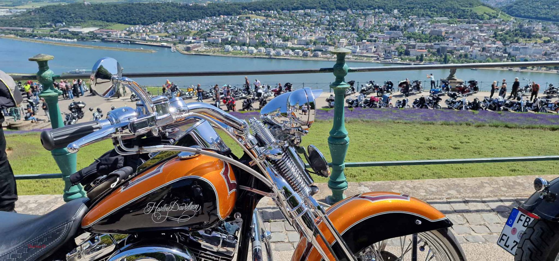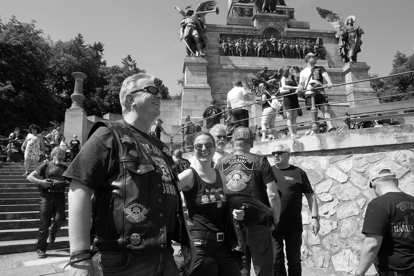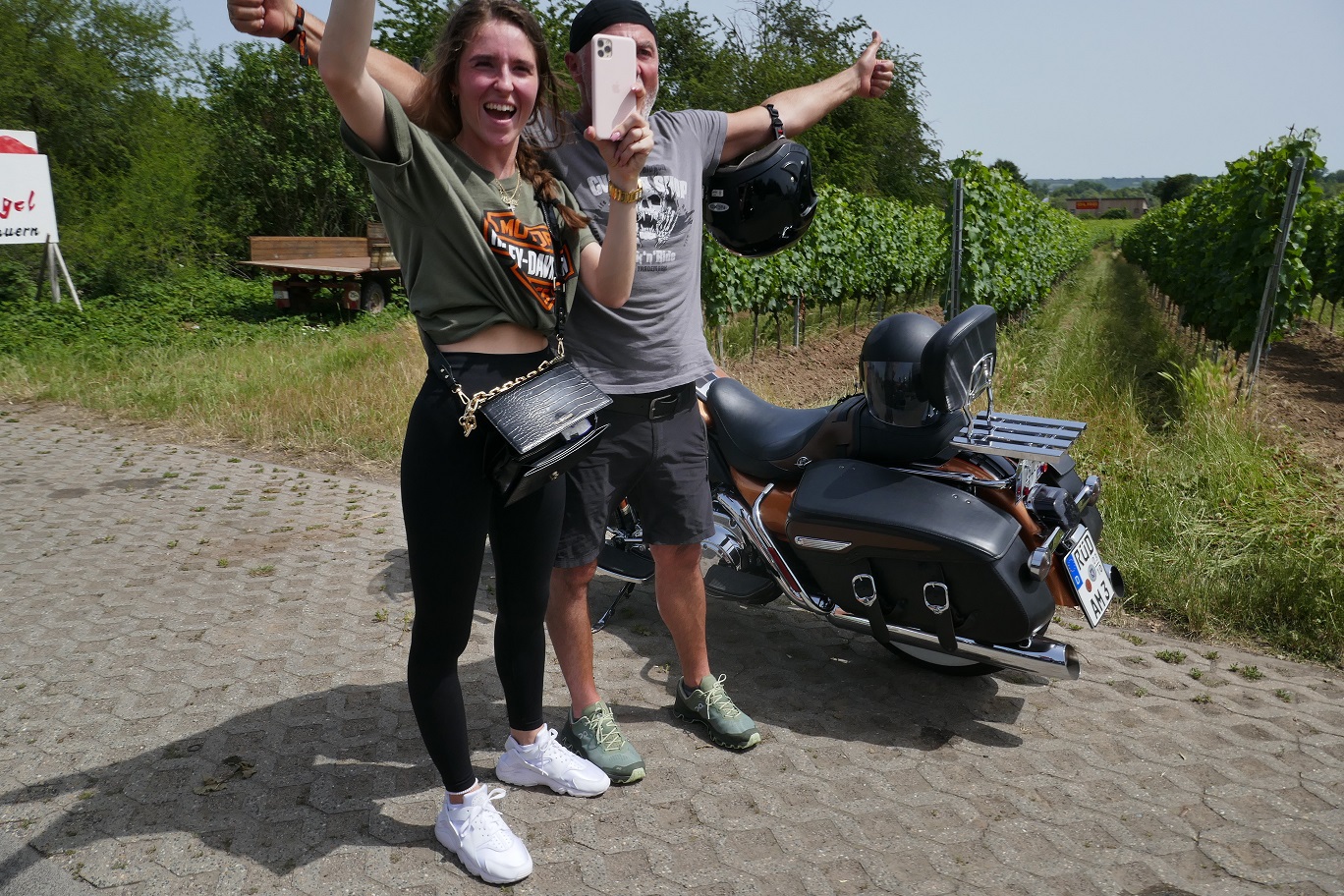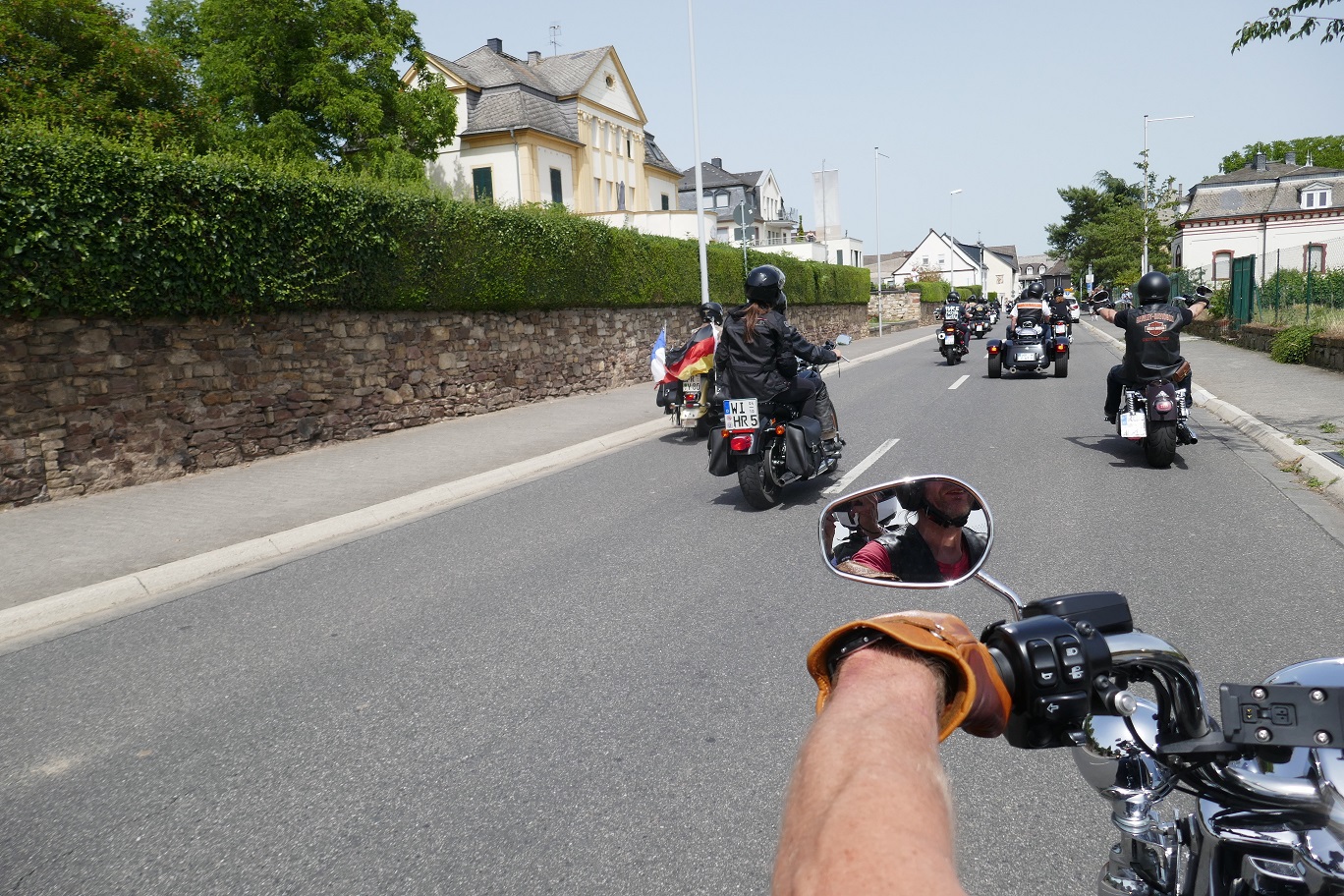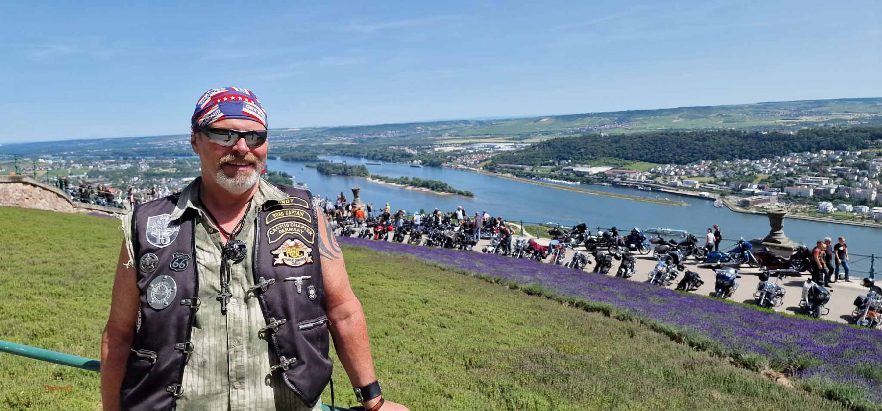 Tag 2:Nach einem gemeinsamen Frühstück unter unseren Bäumen fuhren die Biker zur Aufstellung für eine geführte Rundfahrt. Unser Director Achim verließ uns leider in Richtung Bielefeld. Emel und ich fuhren durch den Rheingau und füllten in einem wunderschönen Weingut die Riesling Vorräte auf. Anschließend ging es zum Niederwalddenkmal. Dieses war auch Endpunkt der geführten Touren und somit kamen wir wieder alle zusammen. Die Organisatoren der MBR hatten eine Sondergenehmigung für die Harley´s und alle durften für ein Fotoshooting direkt vors Denkmal fahren. Eine superschöne Sache mit toller Aussicht. Am Abend gab es eine Pizza in der Pizzeria am Campingplatz und dann wieder die Tour übers Festival.