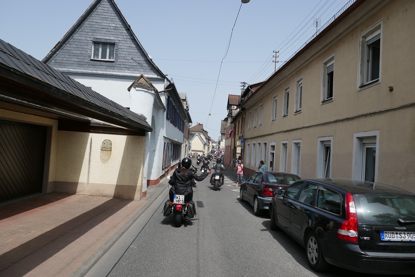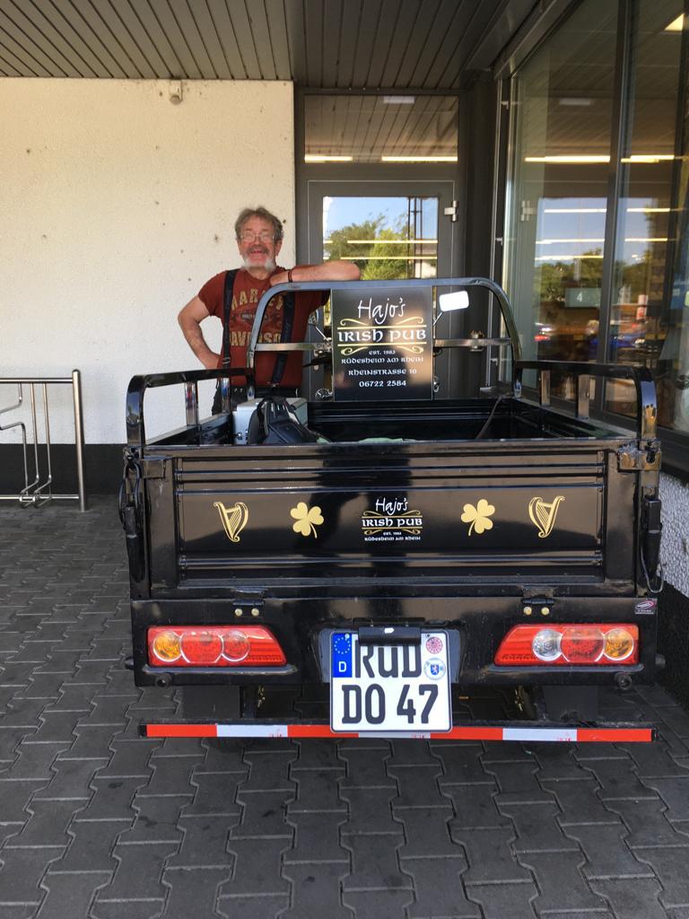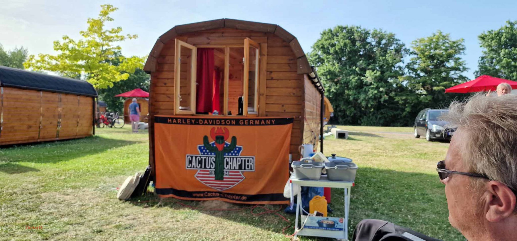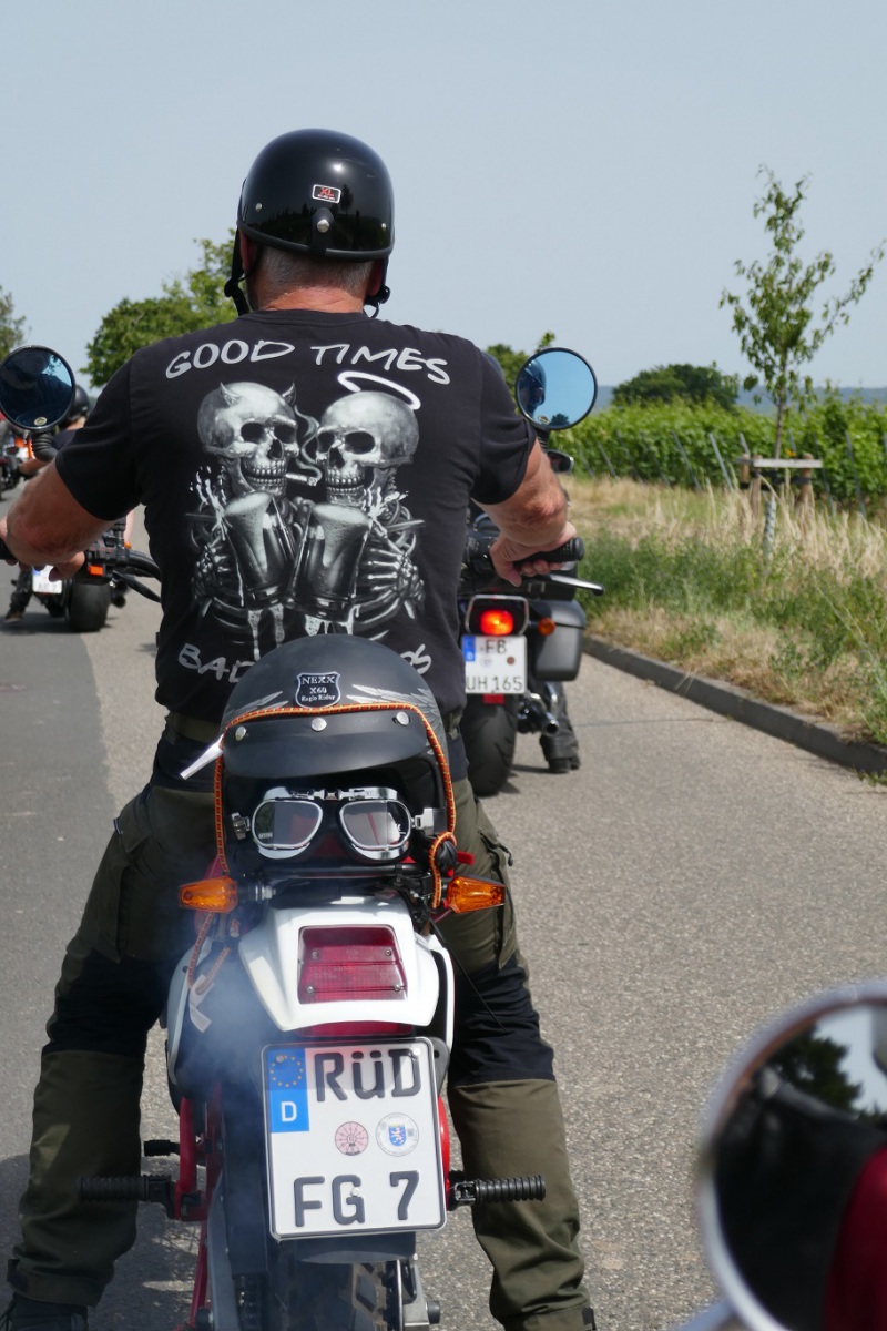 Wir trafen uns bei Erika in Langenfeld zu einem gemeinsamen Frühstück. Anschließend fuhren die Biker unter Führung vom Road Captain Andreas eine schöne Strecke nach Rüdesheim. Emel und ich hatten den Material- und Verpflegungswagen und wir fuhren über die Autobahn nach Rüdesheim um dort alles für die Biker und deren Ankunft vorzubereiten. Ziel war der Fass-Campingplatz Rheingau524 in Geisenheim. Dort waren 2 Fässer und 3 Hütten reserviert. Der Platz war ein Glückgriff. Alles pikobello sauber, Blick auf den Rhein und direkt vor unserer Hütte 2 große Bäume für den Schatten. Die Bäume haben uns über das heiße WE gerettet ! Nach Ankunft der Biker und einem kühlen Umtrunk ging es das 1. Mal nach Rüdesheim zum Festival. Auf verschiedenen Bühnen gabe dort Musik, eine Händlermeile und natürlich jede Menge Mopeds. Doro aus Düsseldorf war Star des Abends aber nur HaJo konnte das „Geschrei“ länger als 3 Lieder ertragen :-).. wir sind halt älter geworden.