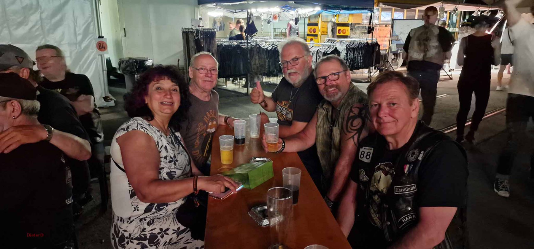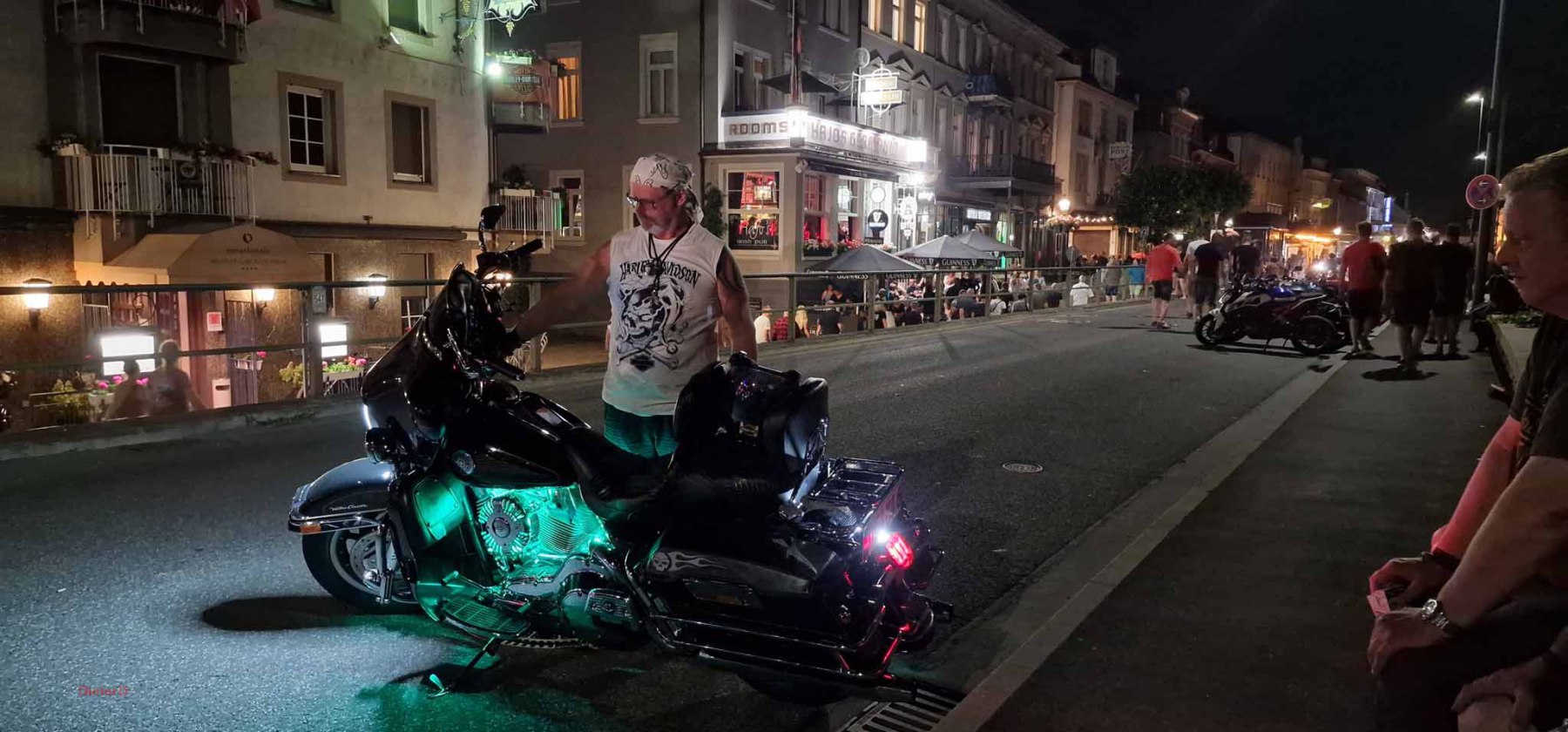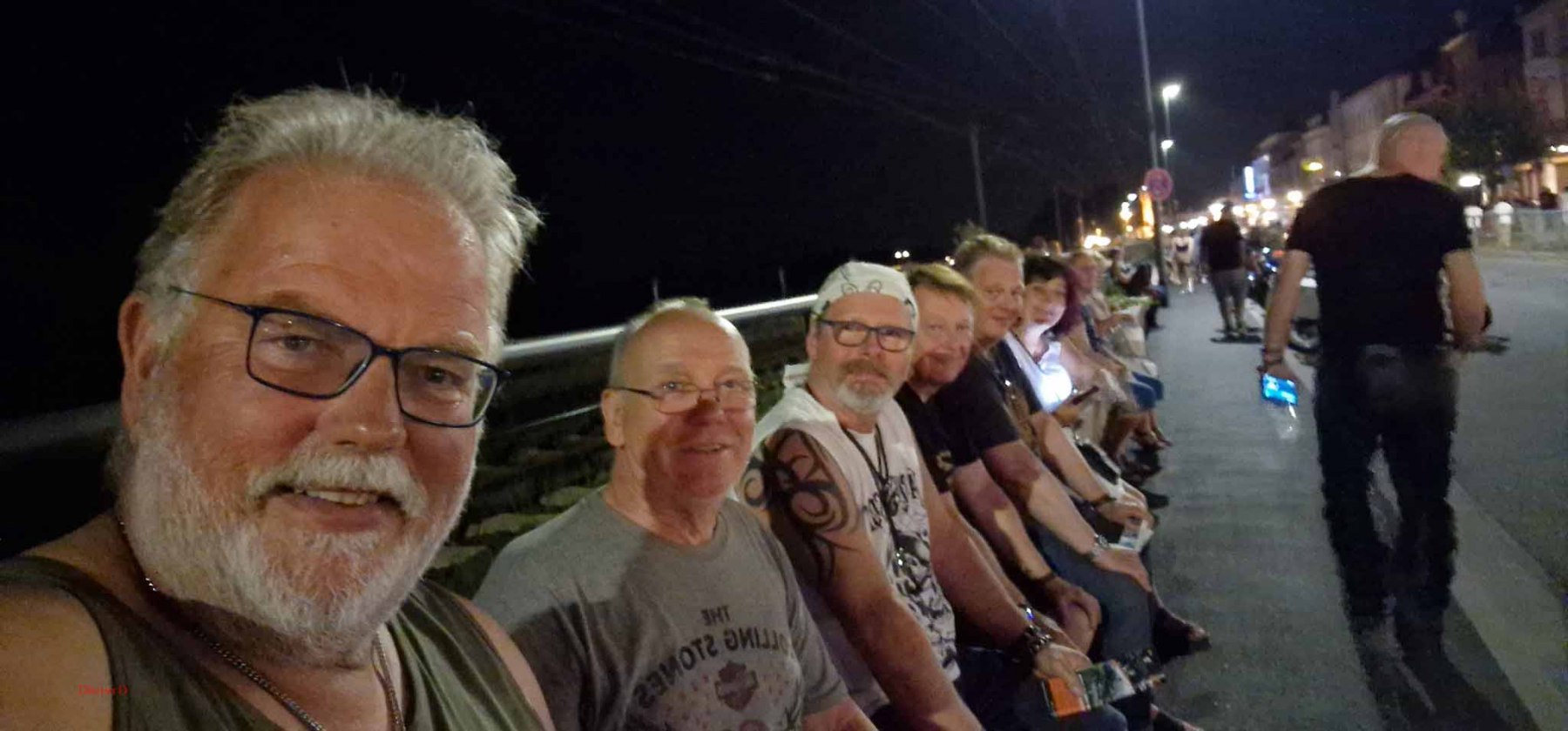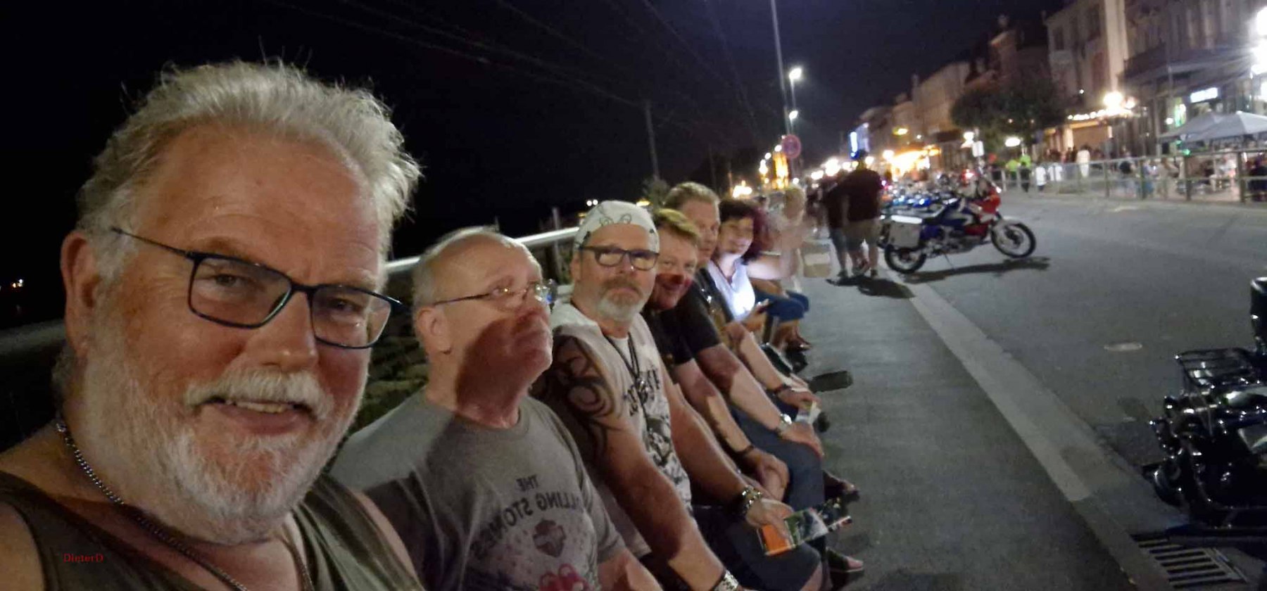Der Samstag wurde extrem heiß und es hatte kaum jemand Lust an der großen Parade teilzunehmen. Das ging wohl vielen Bikern so und deshalb fiel die Parade auch entsprechend kurz aus. Von uns fuhr nur Harald mit und seine schönen Fotos zeigten, wie toll die Rundfahrt war und wieviele Menschen am Straßenrand auf die Parade warteten. Der Rest unserer Gang blieb unter den Bäumen und genoß den Tag mit vielen, kühlen Getränken. Am Nachmittag fuhren Gerd und ich zum Edeka und kauften für einen gemeinsamen Grillabend ein. Es wurde ein schönes, leckeres Menue :-). Im Anschluss dann mit vollen Bäuchen wieder zum Festival. Dort war richtig was los, tolle Stimmung und tausende Motorräder. Den krönenden Abschluß bot dann das große Feuerwerk um 23 Uhr. In dem Video (was noch kommt) werdet ihr sehen, was man gezündet hat. Feuerwerk im Rhytmus der Stones, Suzie Quattro usw. herrlich.